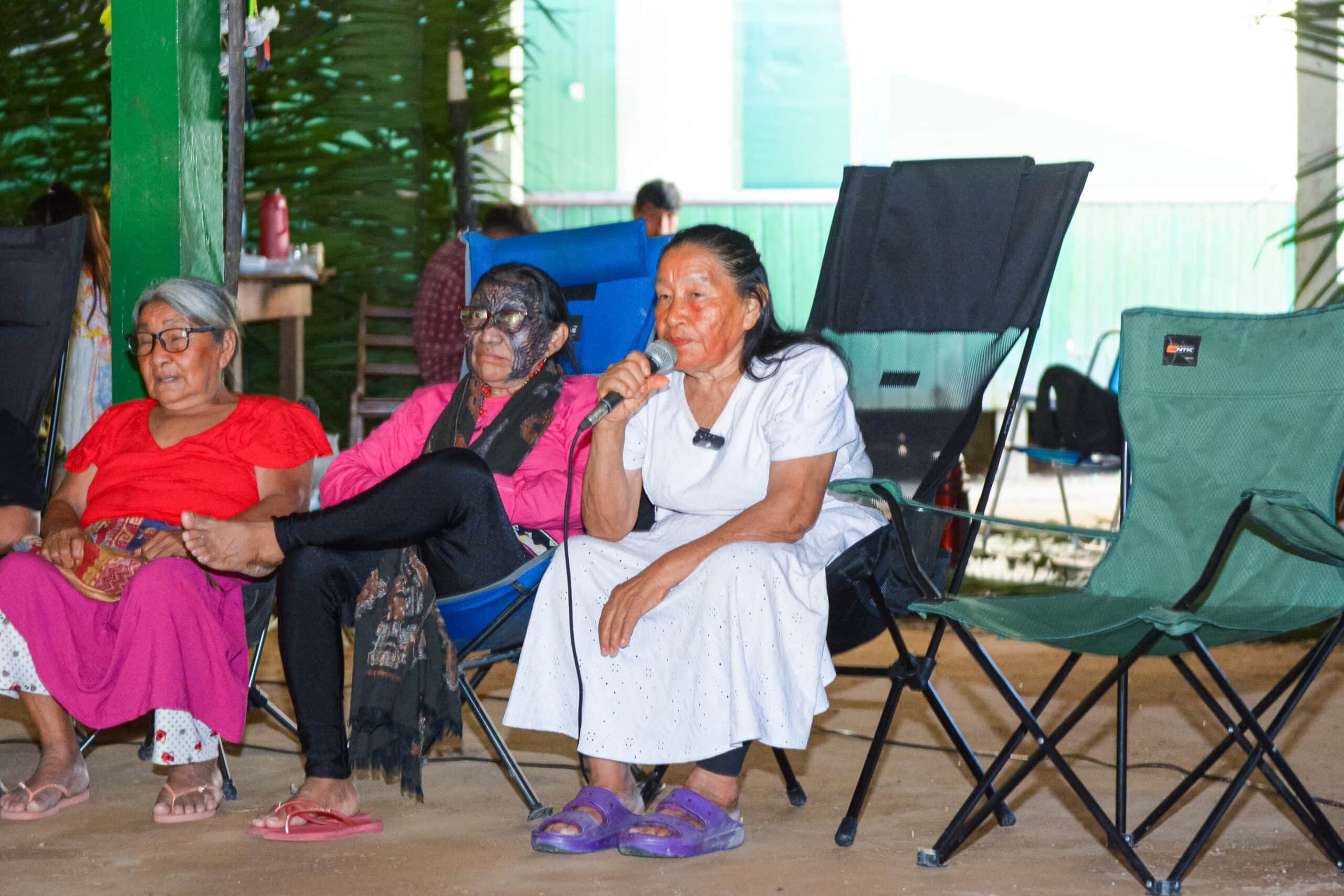 Primeiro Encontro das Mulheres Yawanawá reuniu 14 anciãs em momento especial de relato de experiências. Foto: Marcos Santos/SecomA maioria falando na língua materna Yawanawá, as 14 anciãs do grupo contaram um pouco de suas experiências, das dificuldades que enfrentaram e dos momentos em que as lideranças eram somente dos homens, mas do importante papel que ainda assim desempenharam na história de suas aldeias.