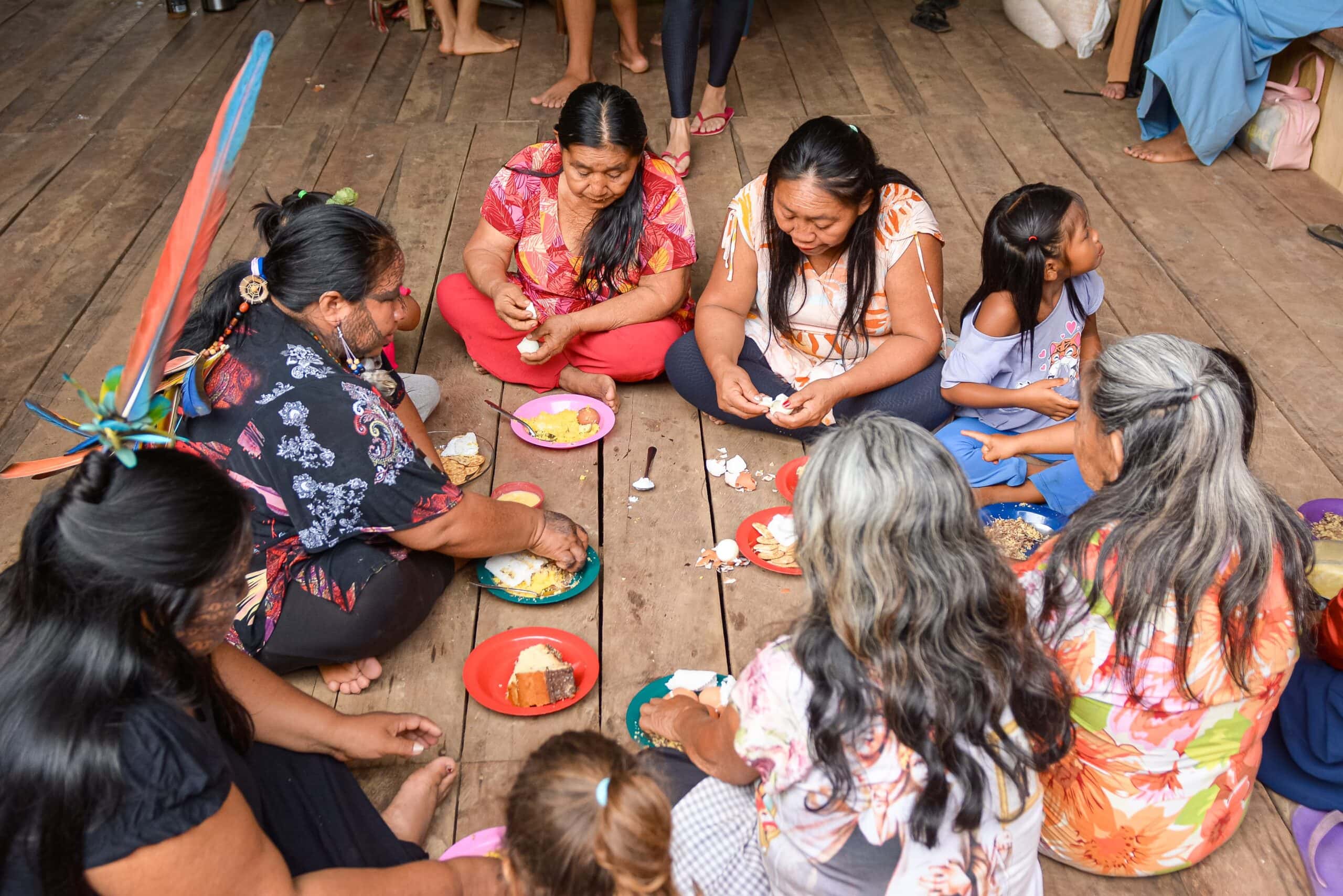 Anciãs Yawanawá estiveram reunidas na casa da cacique Maria Júlia Yawanawá para um café da manhã. Foto: Marcos Santos/SecomAntes de se deslocarem para o Centro Awavãna, espaço que sediou o evento, as anciãs estiveram reunidas, com a participação da Sepi, em um café da manhã na casa da cacique Maria Júlia. Durante o momento íntimo, emocionante e de muitas risadas, as mulheres compartilharam um pouco de suas vivências e demonstraram alegria por participar de um evento tão importante para o Povo Yawanawá.