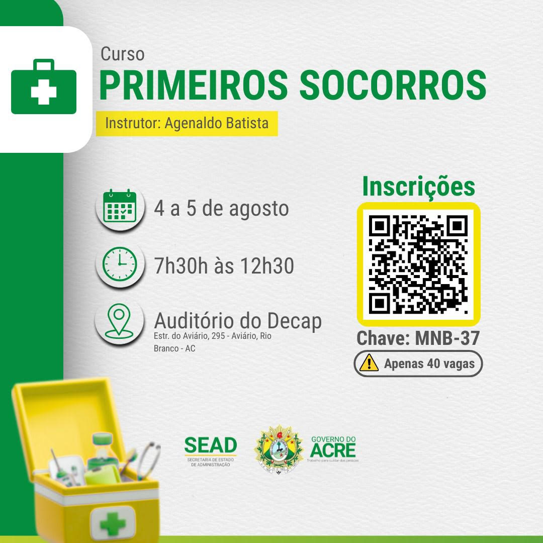 O governo do Acre, por meio da Secretaria de Estado de Administração (Sead), promove na segunda-feira, 4, um curso de primeiros-socorros, das 7h30 às 12h30, no auditório do Departamento de Capacitação e Formação do Servidor (Decap), localizado na Estrada do Aviário, nº 295, bairro Aviário, em Rio Branco.