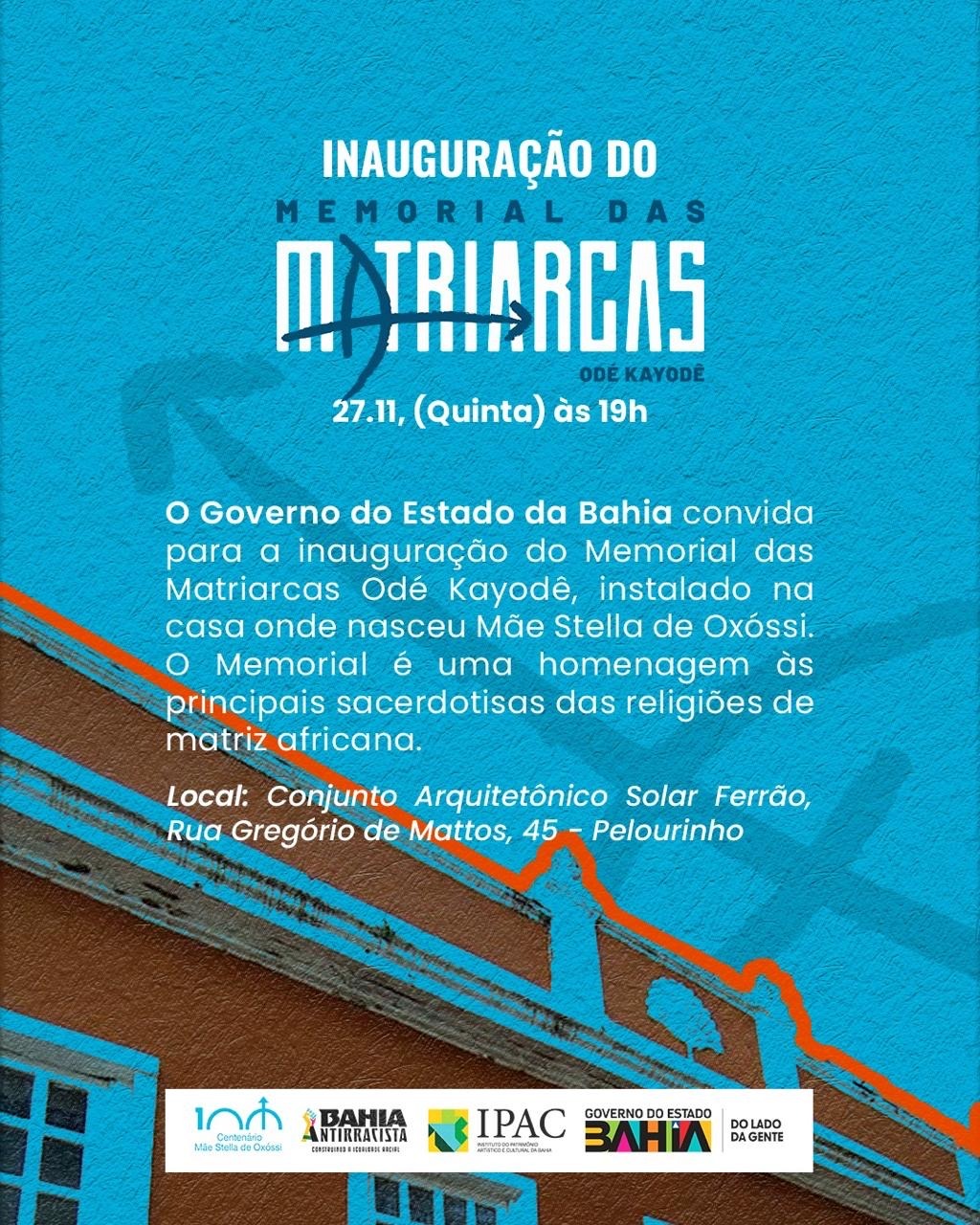 O Governo do Estado da Bahia inaugura nesta quinta-feira (27), às 19h, o Memorial das Matriarcas Odé Kayodé, novo espaço cultural dedicado às principais matriarcas das religiões de matriz africana. O Memorial será instalado na casa onde nasceu Mãe Stela de Oxóssi, uma das mais importantes ialorixás do país.