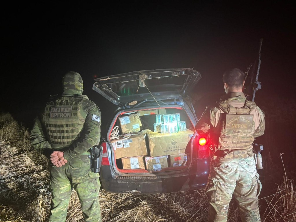 Guaíra/PR. Na madrugada do dia 27/9, Policiais Federais,em ação integrada com Policiais Militares do BPFRON/PMPR, avistaram na área rural do município de Mercedes/PR três veículos trafegando em alta velocidade em conduta típica de comboio transportando ilícitos.