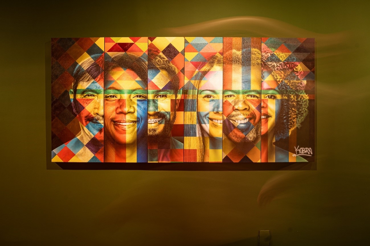 Quem visita a CAIXA Cultural Brasília pode conferir de perto uma obra inédita do muralista brasileiro Eduardo Kobra, criada especialmente para a exposição “Nossos Brasis”, em cartaz até 18 de janeiro. A mostra integra as comemorações pelos 45 anos da CAIXA Cultural.