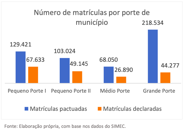 No caso dos municípios de pequeno porte II, que possuem entre 20 e 50 mil habitantes, foram declaradas 49.145 matrículas pactuadas. Já os de médio porte, com 50 a 100 mil habitantes, declararam 26.890, e os de grande porte, com mais de 100 mil habitantes, 44.2.
